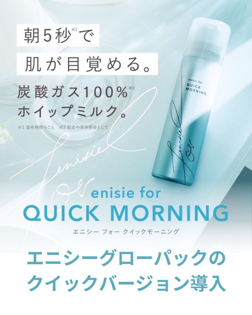 エニシーグローパックでお馴染みの炭酸ガスより朝に忙しい時にもサッとお手入れ出来るホイップミルクが入荷しました。グローパックはなかなか時間がかかり大変というお客様にも!
