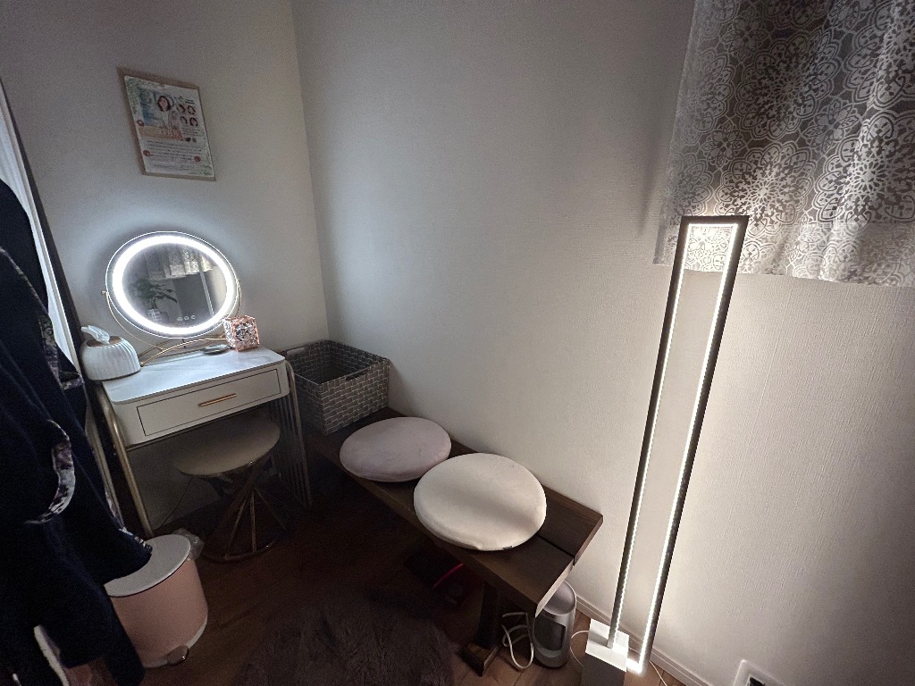 フェイスやボディの変化をみていただきたく女優ライト設置させていただきました。脱毛は灯りをつけての施術となりますが、リラクゼーションや痩身・フェイシャルはライトダウンして施術させていただいています。またお客様に合わせた照明も承りますのでお声かけください。